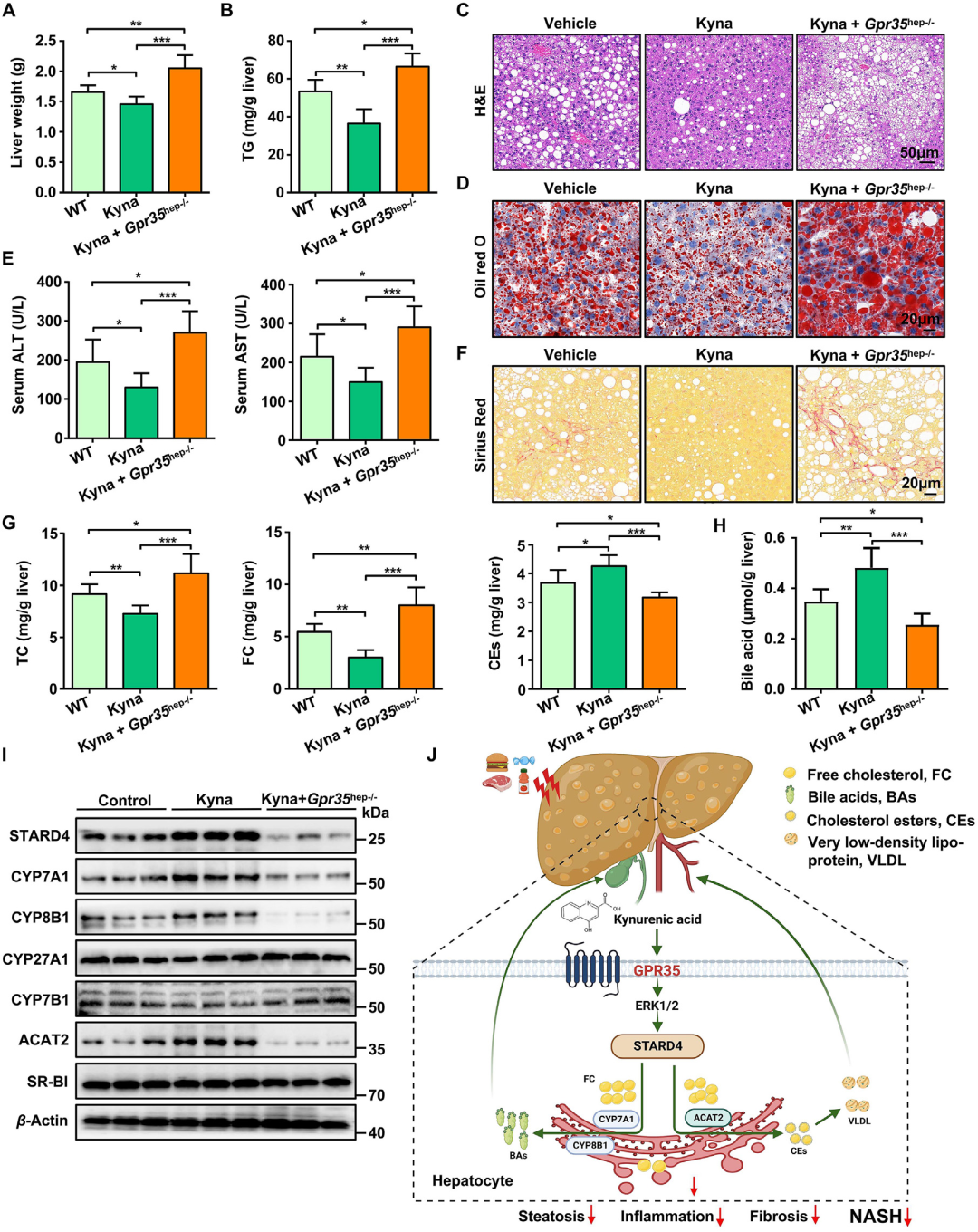 Kyna是孤儿受体GPR35的内源性激动剂。既往研究表明,Kyna可通过激活脂肪组织中的GPR35增加能量消耗。本研究进一步探究Kyna是否能抑制HFCF饮食诱导的肝脏脂肪性肝炎。研究人员将WT小鼠和肝细胞特异性GPR35敲除(Gpr35hep−/−)小鼠饲喂HFCF饮食8周,待其出现显著体重增加和糖耐量受损后,每日腹腔注射Kyna(5 mg/kg体重),并继续HFCF饮食8周。结果显示:与溶剂对照组相比,Kyna处理的WT小鼠肝脏重量和TG含量显著降低。长期Kyna干预改善了HFCF饮食16周诱导的肝脂肪变性、损伤及纤维化。而肝细胞中GPR35表达的缺失阻断了Kyna的保护作用。Kyna干预显著降低了肝脏TC和FC水平,同时增加了CEs和胆汁酸含量。这一效应与Kyna介导的胆固醇代谢相关蛋白(CYP7A1、CYP8B1和ACAT2)表达上调密切相关。当敲除Kyna的受体GPR35后,Kyna对胆汁酸生成和胆固醇酯化的促进作用完全消失。此外,与GPR35过表达小鼠的结果一致,Kyna处理激活了肝脏中的ERK1/2-CREB-STARD4信号通路。综上,Kyna通过激活肝脏中的GPR35受体,抑制HFCF饮食诱导的脂肪性肝炎,其机制涉及胆固醇代谢重编程及下游信号通路的协同调控。