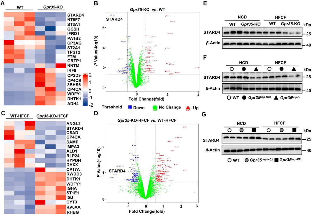 为进一步探索肝细胞GPR35调控胆固醇稳态的机制,研究者通过串联质谱标签(TMT)标记技术对HFCF饮食或NCD喂养的Gpr35-KO与WT小鼠肝组织进行了深度定量蛋白质组学分析,共鉴定出7049种蛋白。通过多重样本检验(假发现率FDR阈值设为0.05)筛选出表达量显著差异的蛋白(变化≥1.5倍且P<0.05)。在NCD喂养的小鼠中,与WT小鼠相比,Gpr35-KO小鼠肝脏有38种蛋白表达上调,18种下调。其中,参与胆固醇胞内转运的蛋白STARD4(UniProt编号:Q99JV5)表现出最显著的表达下调。在HFCF饮食喂养的Gpr35-KO小鼠中,与WT小鼠相比,77种蛋白表达上调,55种下调,且STARD4表达显著降低。通过Western blot进一步验证了Gpr35-KO小鼠肝脏中STARD4的表达低于WT小鼠。STARD4蛋白属于进化保守的类固醇生成急性调节蛋白(StAR)相关脂质转移蛋白家族,广泛表达于多种组织(以肝脏和肾脏水平最高),是一种高效可溶性固醇转运蛋白,对维持胆固醇稳态至关重要。研究表明,STARD4通过将胆固醇运输至ER,促进ACAT2依赖的胆固醇酯化,并提高BAS速率。值得注意的是,STARD4在胆固醇向ER递送中发挥关键作用,而ER富含BAS中性途径的关键酶CYP7A1。实验证实,GPR35促进了肝脏胆固醇向胆汁酸转化及酯化过程。Western blot结果显示,与对照组相比,HFCF饮食喂养的Gpr35hep-/-小鼠肝脏STARD4表达降低,而Gpr35hep-OE小鼠则显著升高,表明GPR35正向调控STARD4表达。因此,作者推测STARD4可能是GPR35通过维持胆固醇稳态在肝细胞中发挥抗脂肪性肝炎保护作用的关键介质。