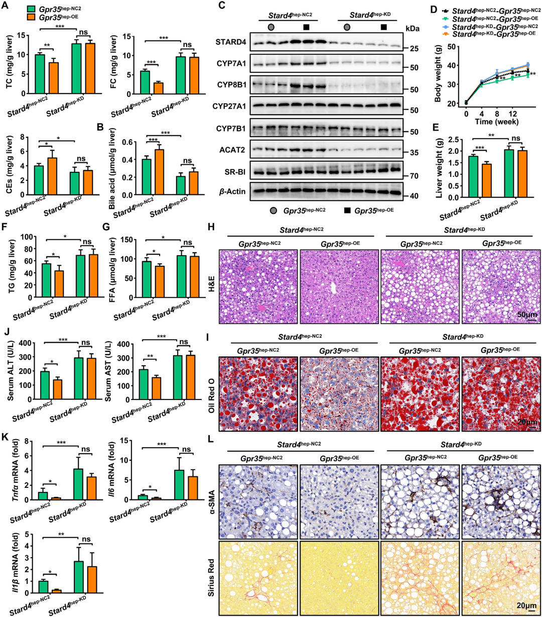 为验证上述假说,研究人员向Gpr35hep-NC1或Gpr35hep-/-小鼠静脉注射AAV8-TBG-m-Stard4-3xFlag-mCherry病毒以增加STARD4表达,随后饲喂HFCF饮食16周。结果显示,在Stard4hep-NC1小鼠中,肝细胞GPR35敲除导致肝脏TC和FC水平升高,CEs及胆汁酸水平降低;而在Stard4hep-OE小鼠中,这些变化被完全逆转。肝细胞GPR35敲除引起的CYP7A1、CYP8B1和ACAT2表达下调在Stard4hep-OE小鼠中得以恢复。与此一致,在Stard4hep-NC1小鼠中,肝细胞GPR35缺失加剧了脂肪性肝炎表型(表现为体重、肝脏重量、肝脏TG和FFA含量增加,肝脏脂肪变性、肝损伤及纤维化加重),而Stard4hep-OE小鼠中未观察到上述恶化效应。