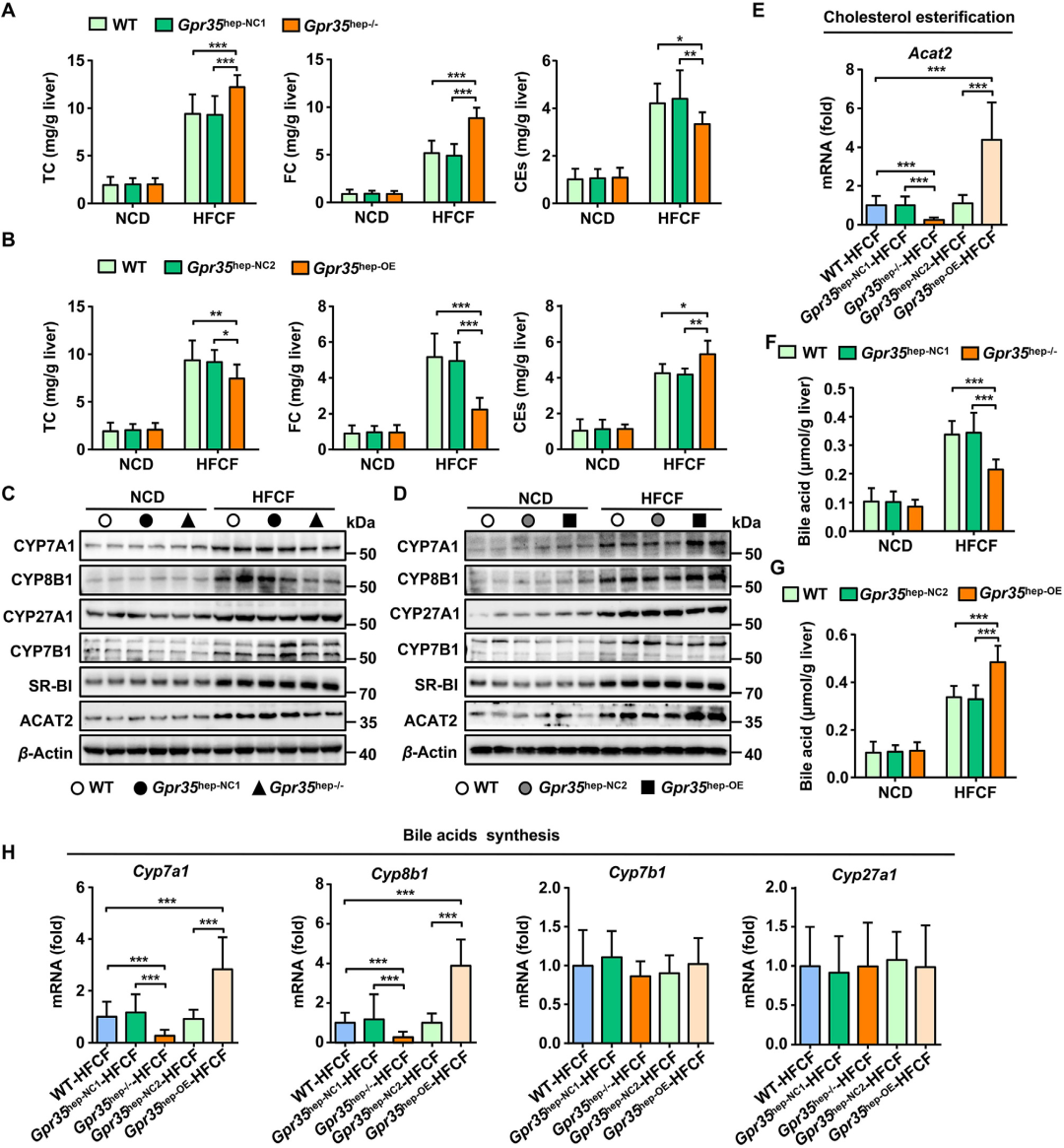 值得注意的是,Gpr35hep-/-小鼠肝脏中的总胆固醇(TC)和FC水平显著升高,而胆固醇酯(CEs)水平降低。相反,Gpr35hep-OE小鼠肝脏中的TC和FC水平下降,CEs水平升高。胆固醇酯化是肝脏排泄FC的重要途径,肝细胞中ACAT2介导的CEs形成可直接促进肝脏胆固醇分泌至血液中。与CEs水平的变化一致,HFCF饮食喂养的小鼠肝脏中GPR35表达上调了Acat2的蛋白和mRNA表达,表明GPR35促进胆固醇酯化。