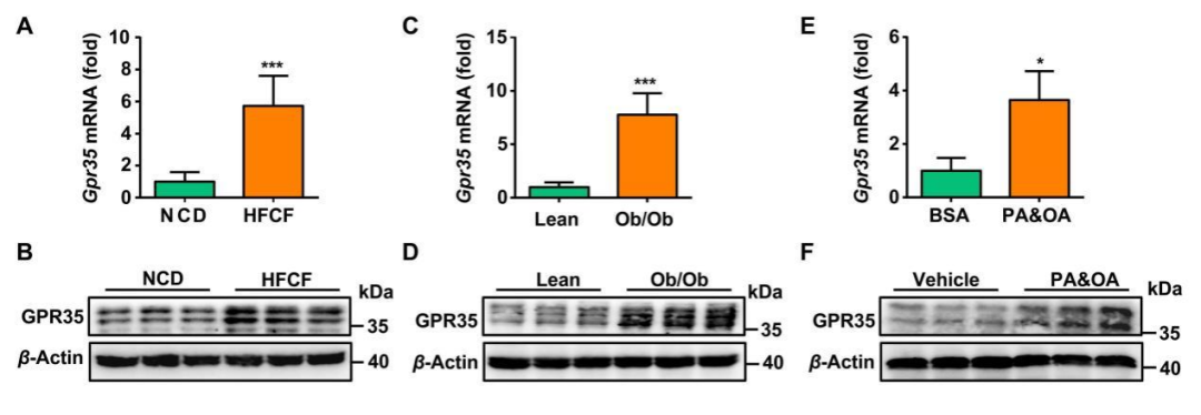 为探究GPR35在肝脏代谢中的作用,研究人员检测了NAFLD小鼠肝脏中GPR35的表达水平。8周龄C57BL/6J小鼠分别接受HFCF饮食或正常对照饮食(NCD)喂养16周。结果显示,与对照组相比,HFCF饮食小鼠肝脏中GPR35的蛋白及mRNA表达显著上调。此外,ob/ob肥胖小鼠肝脏的GPR35表达也较瘦型小鼠明显升高。为进一步验证这一现象是否发生于肝细胞,研究者从野生型(WT)小鼠中分离原代肝细胞,并在体外使用棕榈酸&油酸(PA&OA,肝细胞脂质蓄积和IR诱导剂)刺激。相比于对照组,PA&OA处理显著增加了肝细胞中GPR35的表达。