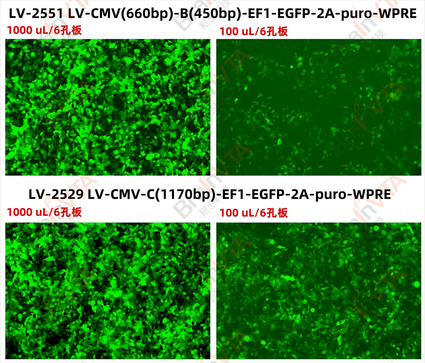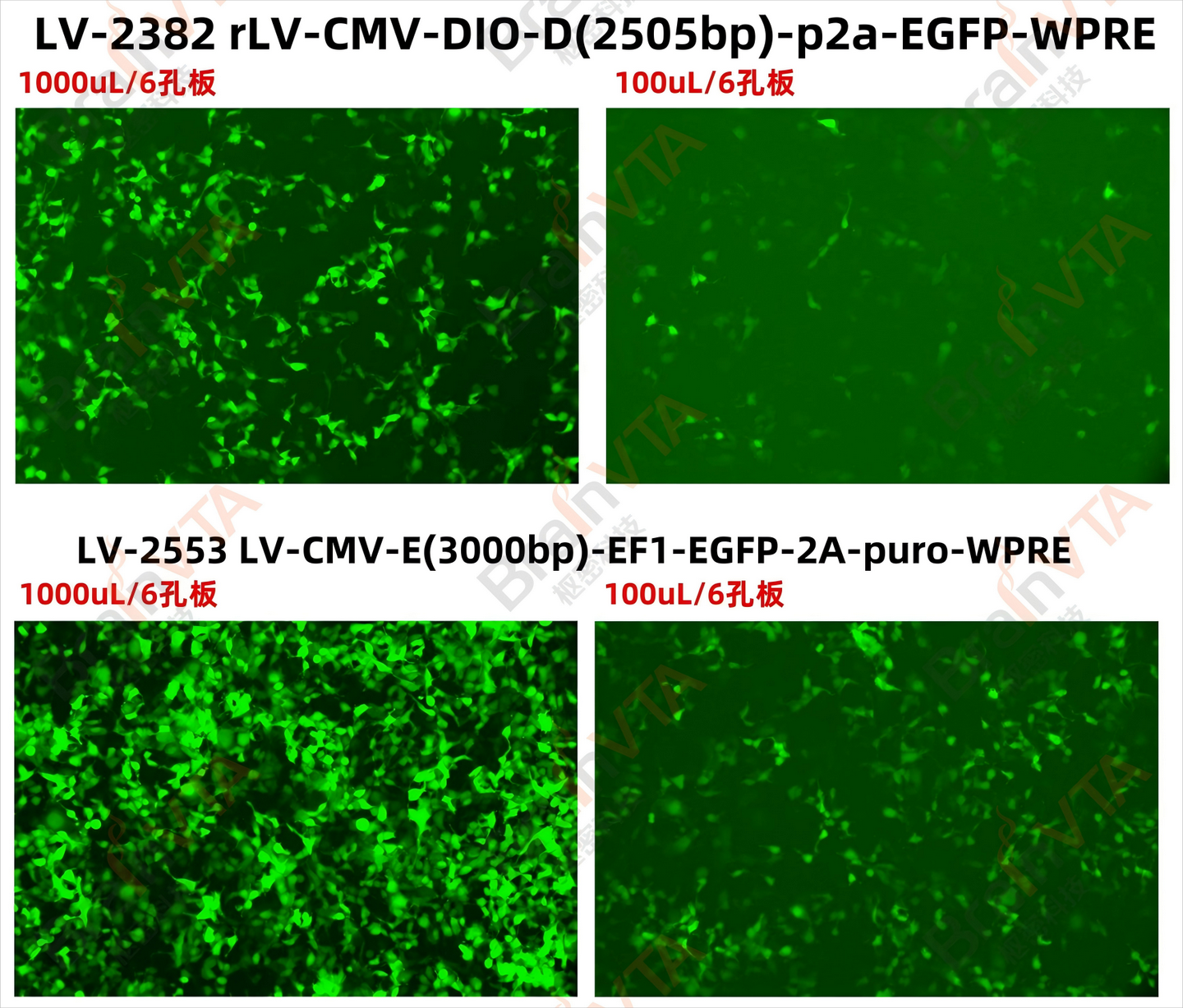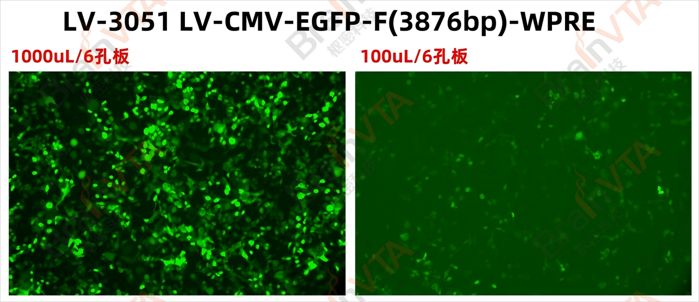3)病毒滴度高,上清最高滴度可达10⁷ TU/mL,无须浓缩,可直接感染。浓缩后可达10⁹ TU/mL;