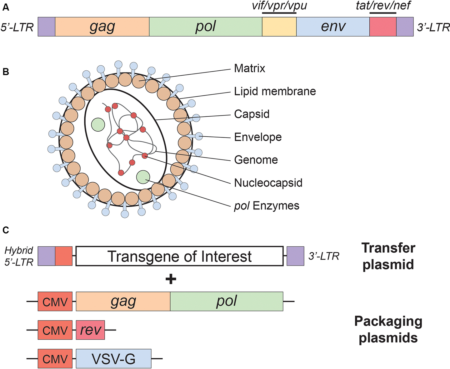 慢病毒基因组结构(A)HIV-1基因组的简化示意图;(B)慢病毒颗粒结构;(C)第三代慢病毒包装系统中使用的质粒。(Rittiner, Joseph Edward et al., Frontiers in molecular neuroscience, 2020.)