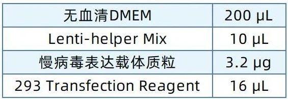 细胞铺皿后的18-24 h内,细胞汇合度达到80-90%时,可以开始转染,配置转染复合物,取无菌的1.5 mL EP管,按照下表组分顺序添加,配置反应体系(10 cm培养皿为例):