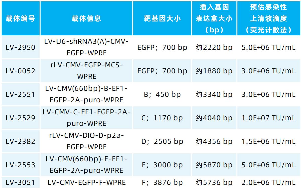 4.慢病毒包装上清滴度,对照病毒和干扰病毒一般在10⁶-10⁷ TU/mL,其它过表达病毒(插入总基因片段<3kb)滴度一般在10⁵-10⁶ TU/mL。