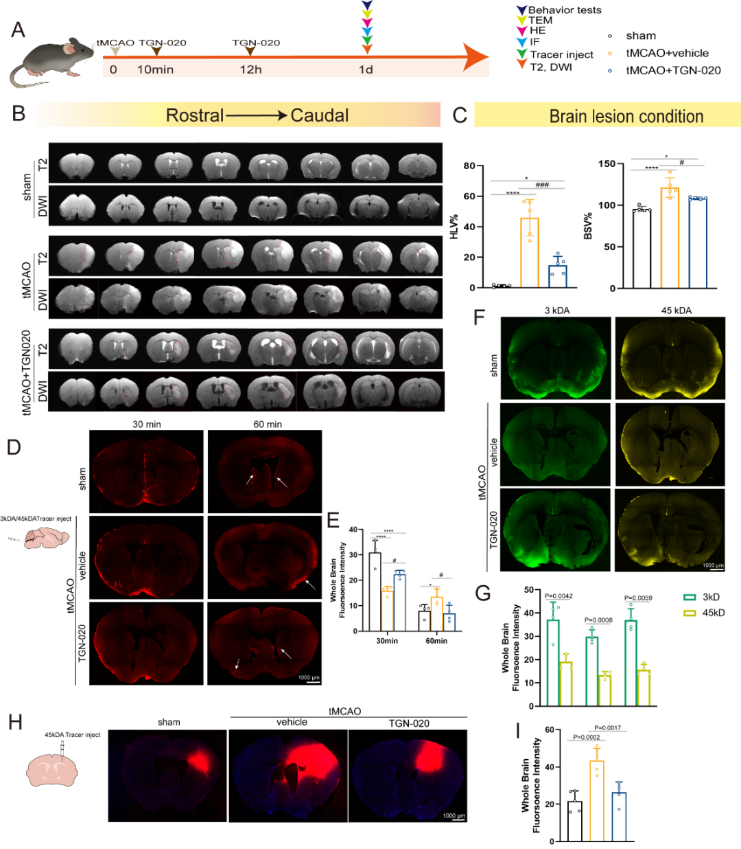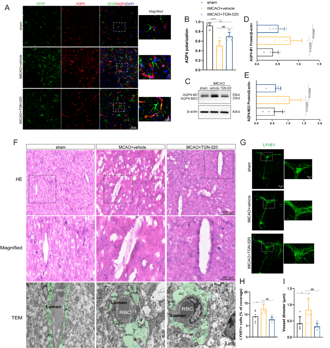 图2.TGN-020改善缺血再灌注小鼠的脑损伤及脑类淋巴系统功能障碍