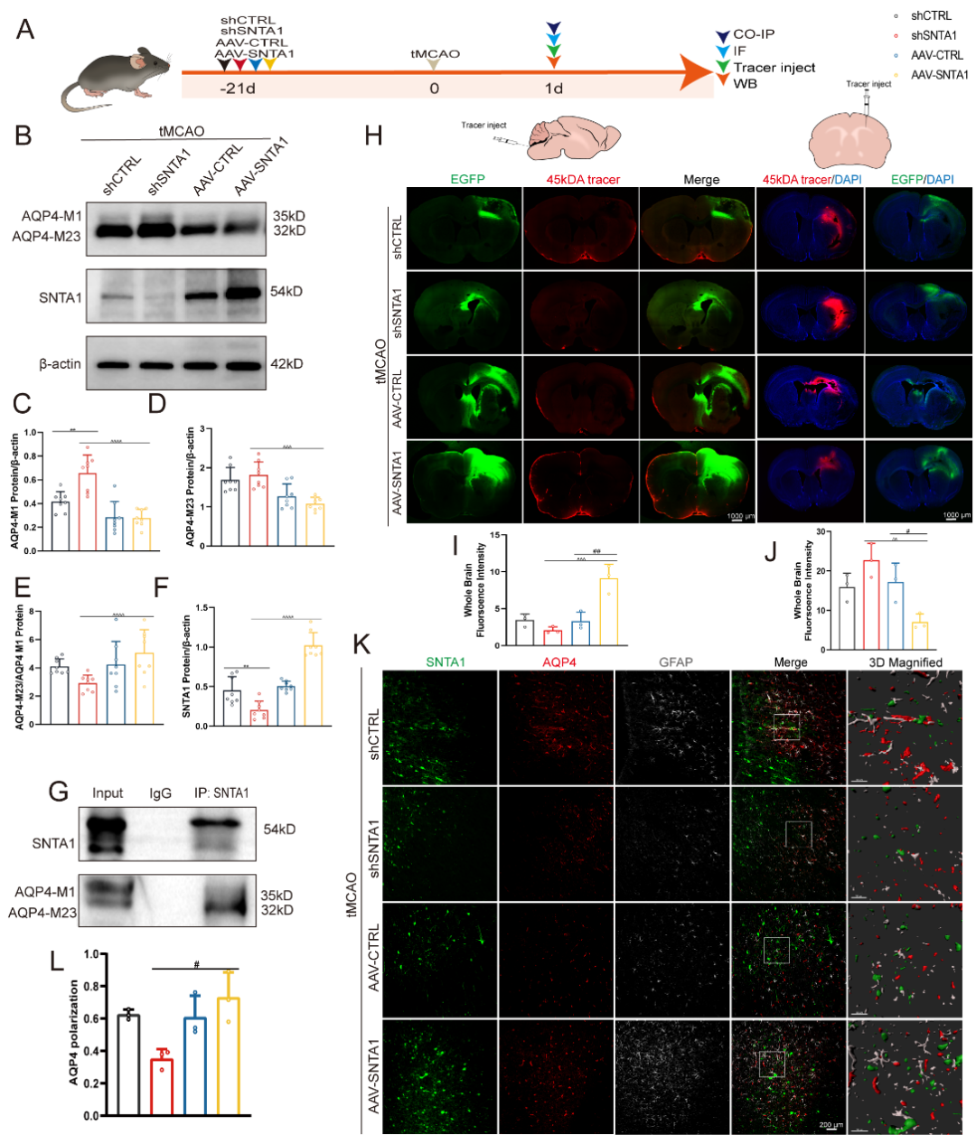 最后,进一步探索疾病机制发现,膜锚定蛋白SNTA1与AQP4-M23异构体存在相互影响作用。使用腺相关病毒敲低或过表达SNTA后发现,过表达SNTA1的缺血再灌注小鼠展现出对脑类淋巴系统液体流动功能与结构组成具有较好的干预效果(图6)。