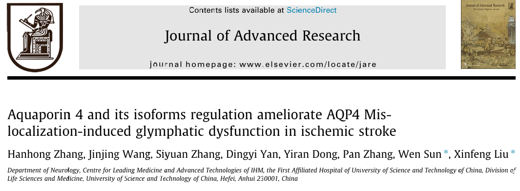 2025年5月20日,中国科学技术大学生命科学与医学部、附属第一医院刘新峰教授、孙文教授课题组在Journal of Advanced Research(IF=11.4)期刊在线发表了题为“Aquaporin 4 and its isoforms regulation ameliorate AQP4 Mislocalization-induced glymphatic dysfunction in ischemic stroke”的研究论文。本研究采用小鼠大脑中动脉闭塞模型模拟临床常见的缺血性脑卒中,结合磁共振成像、分子生物学、形态学、动物行为学等多模态研究方法,通过建立缺血再灌注后的时间梯度,系统探讨了小鼠缺血再灌注过程中脑类淋巴系统的动态变化、调控AQP4及其异构体在缺血再灌注脑类淋巴系统的作用机制。