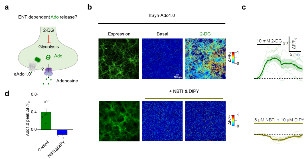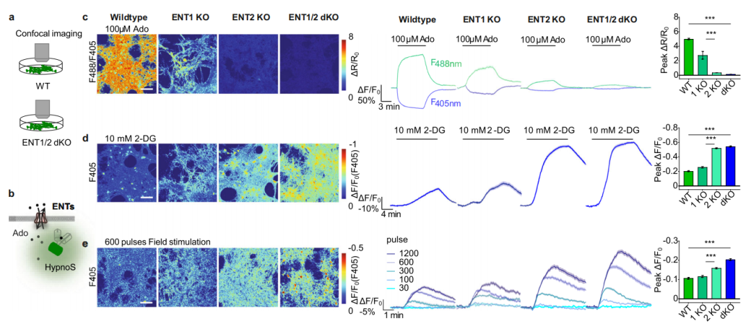 平衡型转运蛋白(ENT1/2)在调节iAdo水平及其与eAdo的耦合中至关重要。不同睡眠-觉醒状态下神经元的iAdo动态在很大程度上反映了使用GRABAdo探针记录到的、与神经元活动相关的eAdo动态,表明iAdo和eAdo之间存在紧密耦合。然而,iAdo如何增加并贡献于eAdo仍不清楚。为研究ENT1/2对Ado转运的影响,研究人员在体外培养细胞和体内利用HypnoS测量了iAdo水平。观察到响应外源性Ado时iAdo水平显著升高;而在缺乏ENT1、ENT2或同时缺乏ENT1和ENT2的海马神经元中,这种升高显著减弱。作者还发现,在糖酵解抑制和神经元激活条件下,与野生型(WT)神经元相比,ENT1/2敲除神经元中的iAdo水平显著升高。此外,在先前的研究中或本文研究者使用ENT1/2抑制剂S-(4-硝基苄基)-6-硫代肌苷(NBTI,5 μM)和双嘧达莫(DIPY,10 μM)时,均未检测到eAdo的增加。这些发现支持在培养的神经元中,iAdo通过ENT1和ENT2共同作用贡献于eAdo的转运。