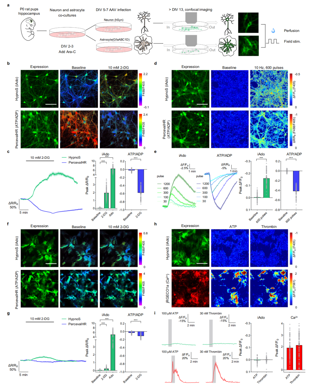 为评估HypnoS监测神经元和星形胶质细胞中响应细胞应激和活动的内源性iAdo动态的能力,研究者对神经元-胶质共培养物施加了两种不同的扰动:代谢抑制和电刺激。结果显示,10 mM 2-脱氧葡萄糖(2-DG)阻断糖酵解,导致神经元中iAdo水平显著增加,这由HypnoS的荧光(F488/F405比值)报告;在表达HypnoS-mut的对照细胞中未检测到此类增加。这种增加伴随着细胞内ATP:ADP比值的下降,这通过PercevalHR(一种ATP:ADP比值传感器)测得。
