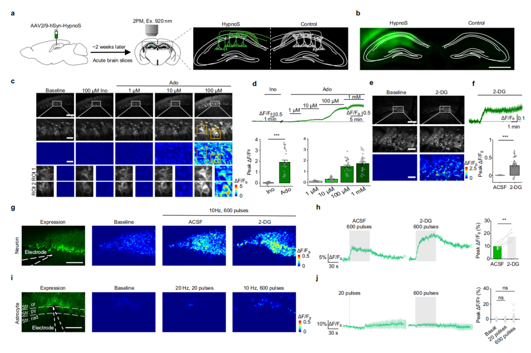 为评估HypnoS检测脑组织中iAdo动态的灵敏度,研究人员使用AAV在小鼠海马CA1神经元中表达该传感器。感染后2-4周的急性脑片的双光子成像显示,响应Ado时,细胞内荧光以单细胞分辨率呈剂量依赖性增加,而对Ino则未观察到显著变化。与培养神经元类似,在急性脑片的神经元中,响应2-DG诱导的代谢抑制和电刺激,观察到iAdo水平逐渐升高。并且,这些刺激的组合导致了iAdo的协同性增加,这与先前关于神经元活动驱动ATP合成的研究结果一致。