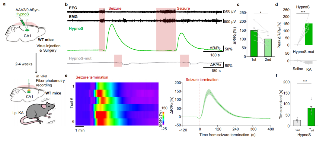 为在自由活动小鼠的深部脑区评估HypnoS在光纤光度法中的应用,研究者在海马CA1区表达了HypnoS或HypnoS-mut,并通过植入的光纤在KA诱导的癫痫模型中记录荧光信号。KA注射后,表达HypnoS的小鼠显示出荧光增强,而在表达HypnoS-mut的小鼠中则未观察到这种增强。在连续癫痫发作期间,第二次癫痫发作时的iAdo幅度低于第一次发作,这一发现与一项基于微透析的研究中观察到的胞外腺苷(eAdo)模式一致,该研究中KA诱导的连续eAdo升高显著减弱。这些发现都支持癫痫发作期间iAdo和eAdo之间存在耦合。值得注意的是,HypnoS信号的增加与EEG测量的癫痫发作终止时间相吻合,这支持了Ado在癫痫发作终止中的作用。信号动力学显示上升时间(τon)约为25 s,衰减时间(τoff)约为80 s,表明HypnoS适用于在自由活动小鼠中实时检测iAdo动态。