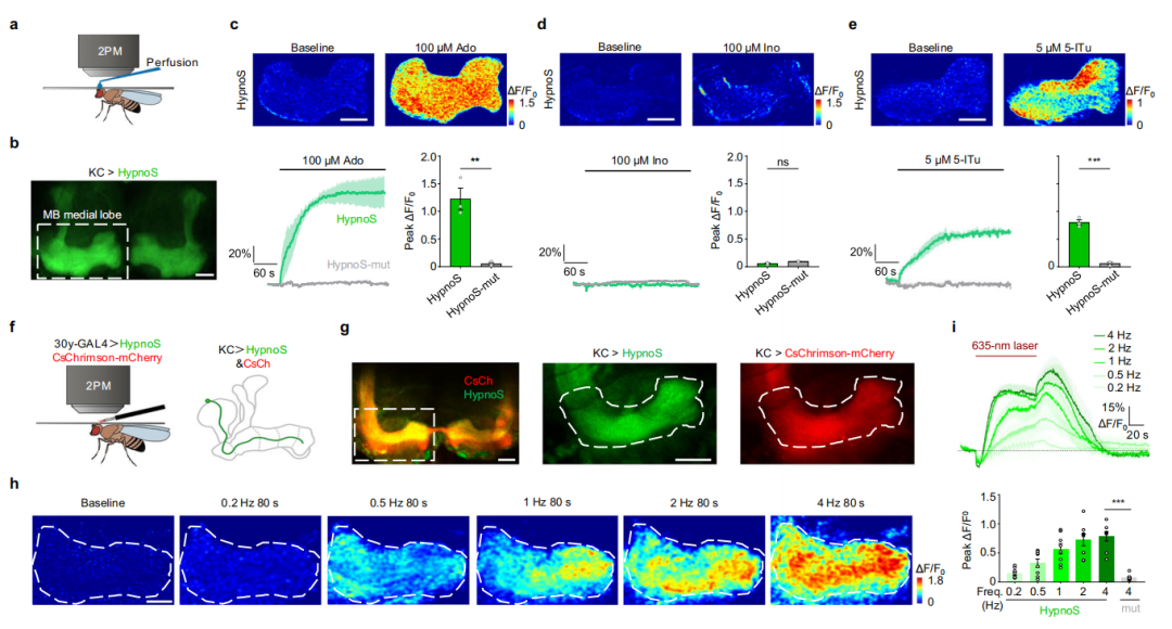 鉴于神经元活动与能量代谢在包括果蝇在内的多种物种中密切相关,研究者在活体内研究了这种关系。作者构建了在蘑菇体(MB)肯扬细胞(Kenyon Cells,KCs)中表达HypnoS的转基因果蝇。对MB内侧叶进行的双光子成像显示,HypnoS特异性地响应Ado,不受Ino干扰。在对照实验中,未观察到表达HypnoS-mut的KCs有响应。抑制AdK增加了iAdo水平,证实了HypnoS报告果蝇内源性Ado变化的能力。
