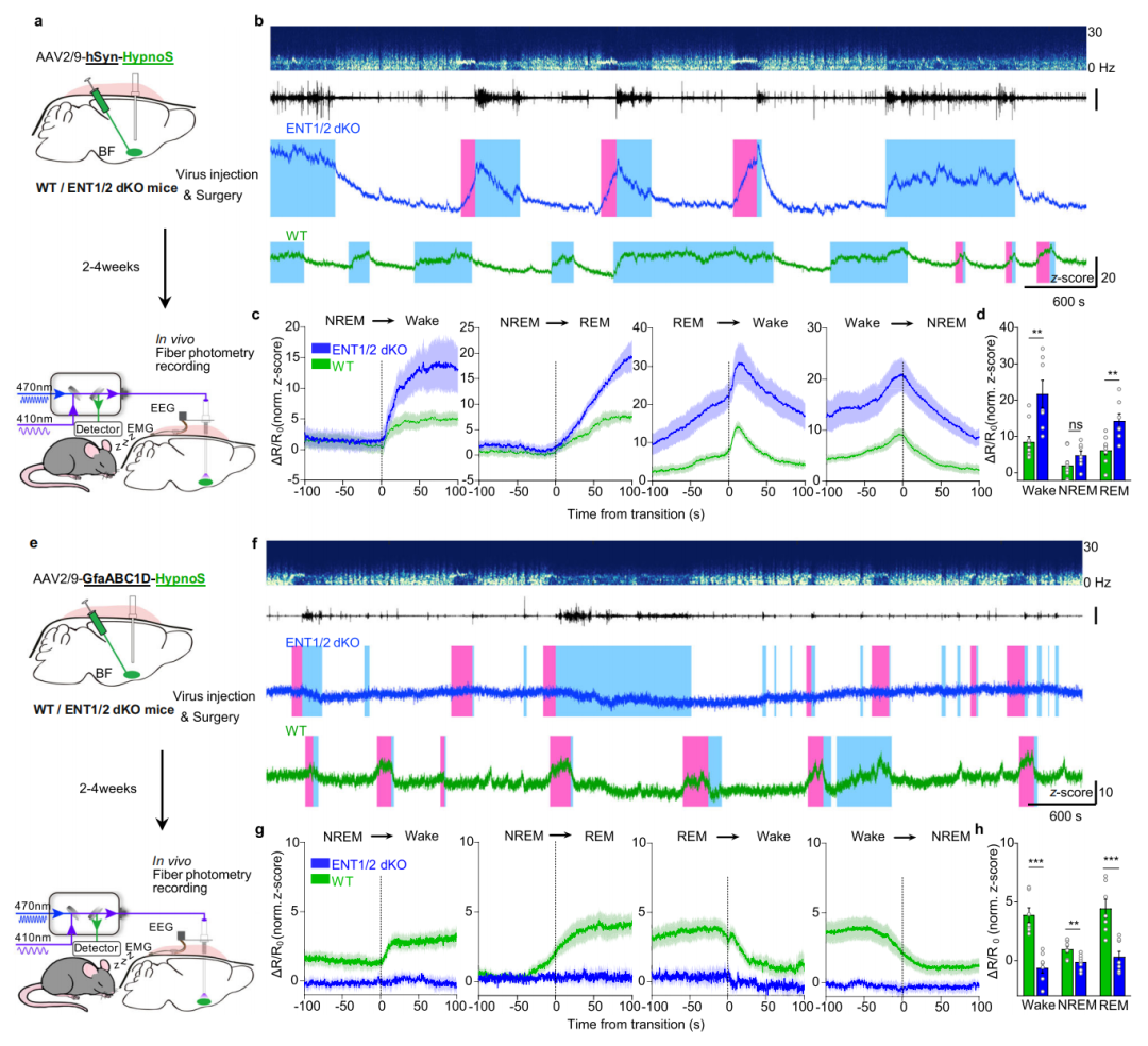 图13.HypnoS揭示睡眠-觉醒周期中ENT1/2介导的Ado转运