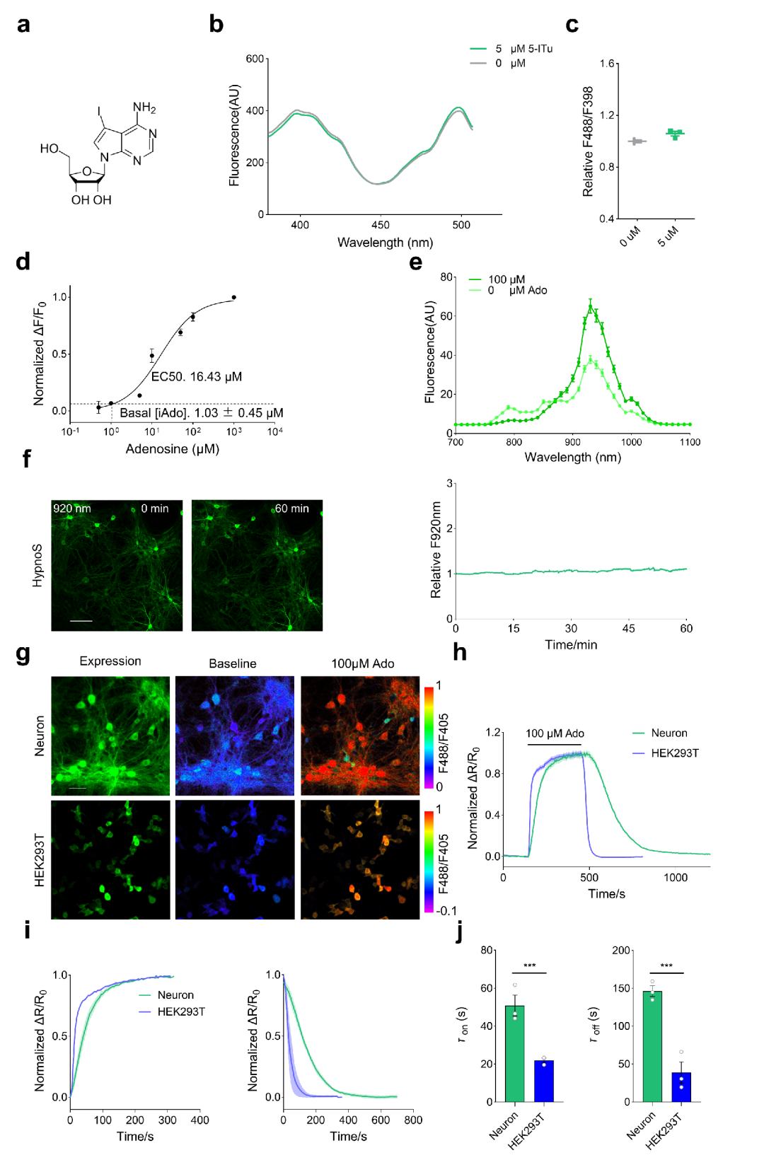 接下来,作者检测了HypnoS在哺乳动物细胞中的定位和亮度。研究人员观察到HypnoS在HEK293T细胞中显示出强烈的胞质荧光,并在施加100 μM Ado时F488/F405比值增加了800%。相比之下,HypnoS-mut无响应。为评估HypnoS监测内源性iAdo动态的能力,研究者用腺苷激酶(AdK)抑制剂5-碘杀结核菌素(5-ITu)处理表达HypnoS的细胞。结果显示,施加5 μM 5-ITu使HypnoS的荧光增加了30%,而HypnoS-mut则无。此外,5-ITu未诱导纯化的HypnoS传感器产生可检测的响应,排除了5-ITu与HypnoS相互作用的可能性。