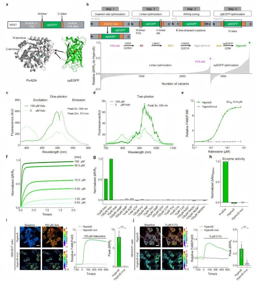 接下来,为增强FFS-AN的亲和力,作者在Ado结合口袋中引入了突变(L85A、G200V、L284C),得到了亲和力改善的变体AV和AVC(EC50分别为9.18 μM和1.51 μM)。然后,在AVC基础上对cpEGFP进行了随机诱变,鉴定出一个具有929%响应的变体(cpEGFP的I23W突变)。于是,作者将此传感器命名为HypnoS(Hypersensitive intracellular adenosine Sensor,超敏iAdo探针)。此外,还构建了HypnoS-mut,一种对Ado不敏感的对照,其在Ado结合口袋中携带V200G和G201K突变,显示出强荧光但无Ado响应。