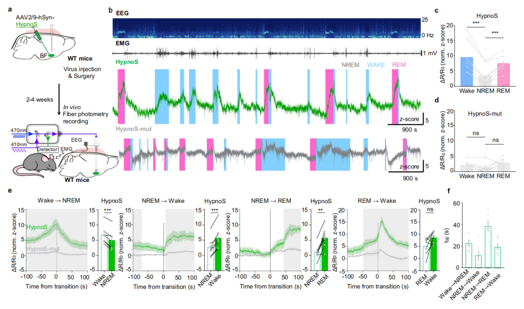 为研究生理性睡眠-觉醒周期中的iAdo动态,研究人员通过AAVs在BF(一个通过Ado信号调节睡眠稳态的脑区)表达了HypnoS或HypnoS-mut。使用光纤光度法(荧光通道)的同时进行EEG和EMG记录,作者观察到在清醒期和快速眼动(REM)睡眠期,iAdo水平显著高于非快速眼动(NREM)睡眠期。在表达HypnoS-mut的小鼠中未检测到此类差异。得益于HypnoS的高时间分辨率,研究者捕捉到了睡眠-觉醒转换期间快速且显著的iAdo变化,睡眠状态转换平均时间(t50)分别为:22.8 s(清醒到NREM)、11.5 s(NREM到清醒)、38.3 s(NREM到REM)和19.3 s(REM到清醒),表明iAdo的增加依赖于神经活动。