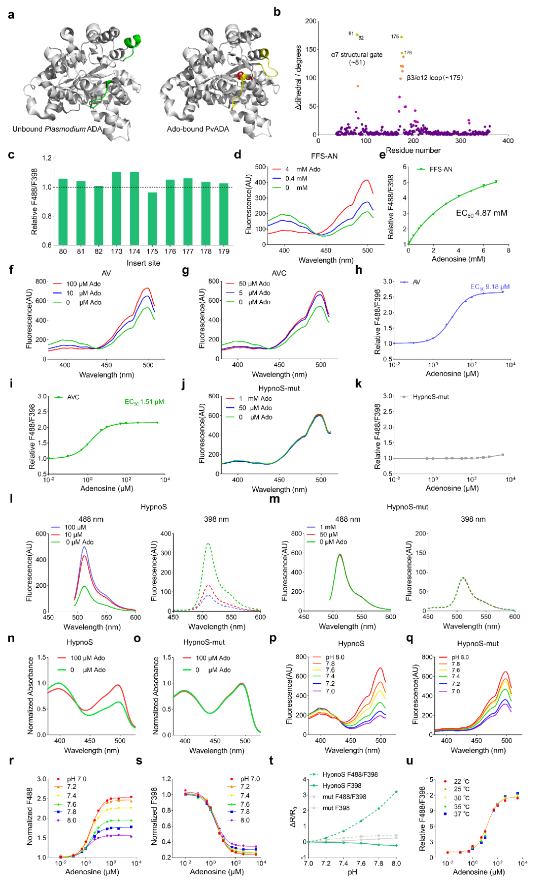 为确定最佳的cpEGFP插入位点,研究人员利用PvADA结构,分析了Ado结合与未结合状态下Cα二面角的差异,这指示了局部构象变化。研究者选择了10个具有显著构象变化的位点进行cpEGFP插入。其中,变体175(cpEGFP插入175-176位残基之间)显示出4%的响应。随后通过连接肽随机化对该响应进行了改进,筛选了超过2500个变体,最终鉴定出变体FFS-AN,其响应达405%,EC50[横坐标(物质浓度)上对应纵坐标(反应强度)为最大反应值的50%时的浓度值]为4.9 mM。