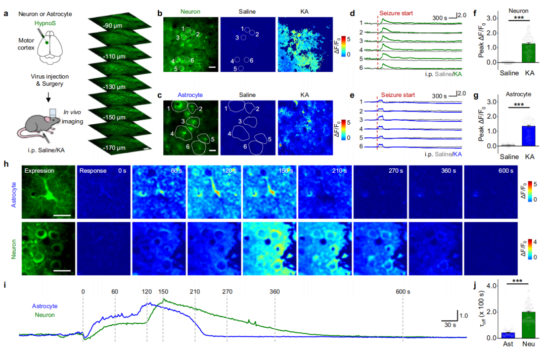接下来,作者通过在神经元特异性(hSyn)或星形胶质细胞特异性(GfaABC1D)启动子下表达HypnoS,研究了神经元和星形胶质细胞之间iAdo动态的差异。在M1/M2运动皮层进行的HypnoS双光子成像显示,KA注射后,神经元和星形胶质细胞中的HypnoS均显示出显著的荧光增强,而HypnoS-mut则未检测到响应。值得注意的是,与星形胶质细胞相比,神经元中的Ado升高表现出更长的衰减时间,这暗示了小鼠体内神经元和星形胶质细胞中存在不同的iAdo代谢途径。这些结果证明了HypnoS在小鼠癫痫发作期间,能够以高灵敏度、分子和细胞类型特异性报告iAdo动态。