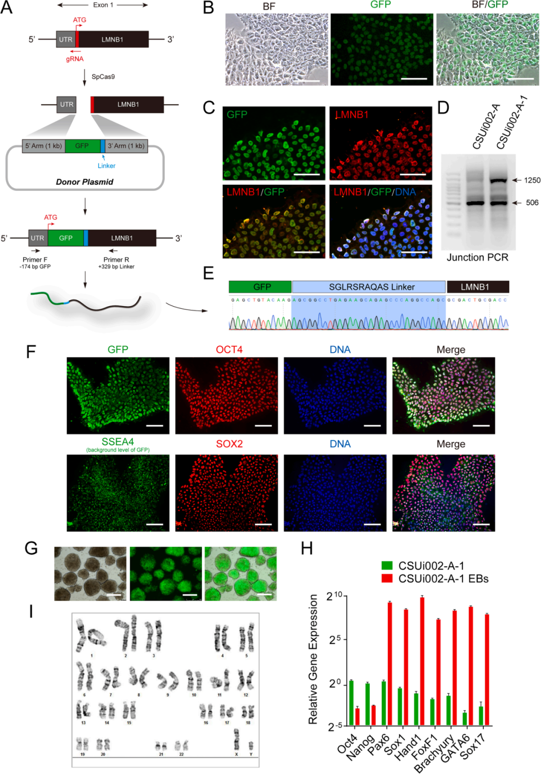 图1.杂合型GFP::LMNB1敲入iPSC的鉴定(Tang Y, Ren J, Li CC. Stem Cell Res. 2021)