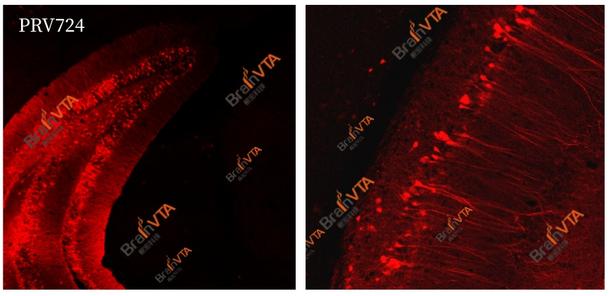 采用免疫荧光检测野生型PRV感染时(PRV抗原),信号通常较弱,需依赖免疫组化等信号放大技术进行检测。为解决这一问题,我司基于Bartha株开发PRV531(EGFP标记)和PRV724(RFP标记),将荧光蛋白基因插入非必需区域,实现高强度组成型荧光表达,无需免疫组化即可直接观察,成为高效的逆向跨多突触示踪剂,适用于标记神经元的多级上游输入连接。