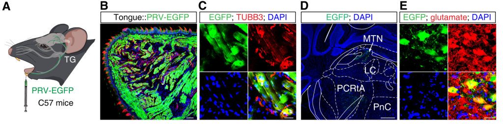 研究人员采用基于病毒的示踪方法探究中脑三叉神经核(MTN)与舌之间的神经连接,具体操作如下:将逆行跨多级突触的伪狂犬病毒(PRV-CAG-EGFP,531#)注入C57小鼠舌内。注射后7天,经心脏灌注4%多聚甲醛固定小鼠,取脑制备冠状冰冻切片,随后对脑片进行谷氨酸特异性抗体免疫荧光染色。结果显示,在包括MTN在内的多个核团中观察到了EGFP+信号。进一步的免疫荧光染色显示,这些EGFP+神经元与谷氨酸特异性抗体呈共标阳性(即同时表达EGFP和谷氨酸),提示其为谷氨酸能神经元。