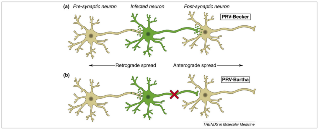 Bartha株(疫苗株):经基因缺失致弱,仅能逆向跨突触传播(从突触后神经元至突触前神经元),可沿神经轴突从外周快速向中枢神经系统扩散,是解析神经网络的常用工具株。