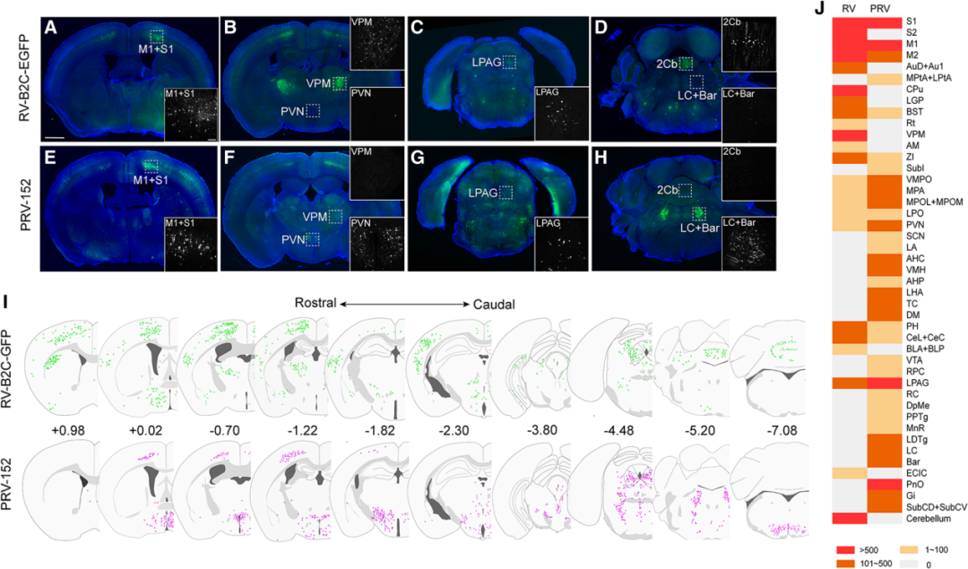 外周-中枢环路:通过PRV示踪四肢、内脏等外周器官向中枢神经系统的传入投射通路(如皮肤-脊髓-丘脑通路),解析躯体感觉或内脏感觉的中枢编码机制。
