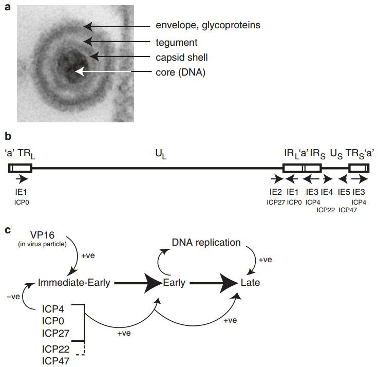 图1. HSV-1病毒粒子结构、基因组结构及基因表达策略(Everett RD et al., Methods Mol Biol, 2014.)