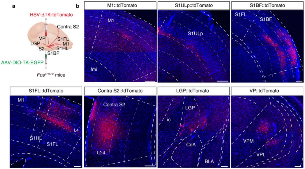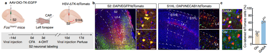 为解析TRAP(活性神经元群体靶向重组技术)标记的S2(次级躯体感觉皮层)与S1HL(初级躯体感觉皮层后肢区)谷氨酸能神经元的连接关系,研究人员在FosTRAP2小鼠(神经元激活时,c-Fos启动子驱动表达他莫昔芬诱导型Cre酶)的S2区注射Cre依赖性辅助病毒rAAV-Ef1α-DIO-EGFP-T2A-TK-WPRE-hGH pA,三周后于同一位点注射HSV-ΔTK-LSL-tdTomato病毒实现顺行跨单突触示踪。病毒表达后,首先在初级运动皮层、上唇区初级躯体感觉皮层、S1HL、LGP(外侧苍白球)及VP(丘脑腹后核)等脑区检测到tdTomato阳性信号。进一步免疫荧光分析显示,这些信号主要分布于S1HL第4层,且与谷氨酸抗体(约30%)和GABA抗体(约65%)共定位,证实TRAP标记的(TRAPed)S2神经元以层级特异性方式主要支配S1HL第4层的GABA能神经元。
