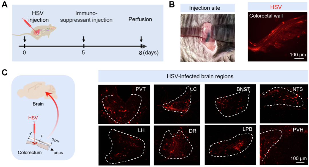为探究可能参与结肠内脏痛处理的脑区,研究人员将单纯疱疹病毒HSV-tdTomato注射至小鼠结直肠壁。8天后,首先在结直肠壁观察到tdTomato标记的神经元。进一步全脑成像分析显示,PVT(丘脑室旁核)、LC(蓝斑)和PVH(下丘脑室旁核)等多个脑区出现特异性荧光信号,证实这些核团与结直肠存在解剖学连接。