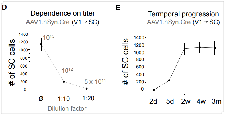 研究人员进一步实验发现,顺行跨神经元传播需要相对较高的病毒滴度,因为随着AAV1滴度降低,标记神经元数量急剧减少。该顺行跨神经元标记最早在注射后5天可观察到,注射后2周完全显现,并稳定保持长达3个月。