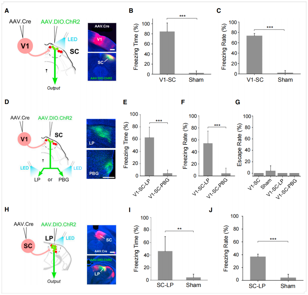 本文示踪结果表明LP是V1输入定义SC神经元的主要轴突靶区,且顺行跨突触标记与逆向标记(CTB 488)联合证实大部分(66%)V1输入定义SC神经元投射至LP。因此研究者探究SC-sg激活诱发的僵直行为是否通过LP介导。结果显示,光遗传激活自由活动小鼠SC-sg神经元在LP的轴突末梢可诱发类似的僵直行为反应(强度稍弱),表明LP参与驱动SC介导的僵直行为。相比之下,激活SC在PBG的轴突末梢不诱发僵直行为,提示PBG不参与此行为。此外,上述末梢激活均未诱导逃跑行为。