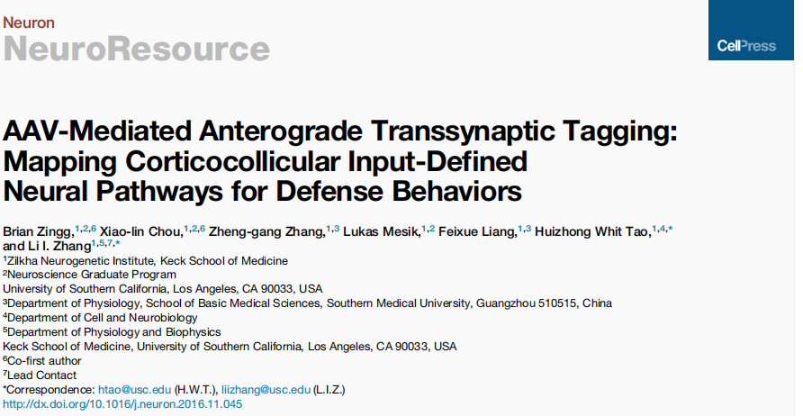因此,2016年12月15日,美国南加州大学凯克医学中心齐尔卡神经遗传研究所张砺教授团队在Neuron期刊(IF=13.974)发表题为“AAV-Mediated Anterograde Transsynaptic Tagging:Mapping Corticocollicular Input-Defined Neural Pathways for Defense Behaviors”研究论文,首次证实腺相关病毒AAV1可顺行跨单级突触传播。该研究发现,突触前神经元转导AAV1-Cre,能够有效且特异地驱动选定突触后神经元靶点中Cre依赖的转基因表达。因此,该技术可用于对后者(即由输入定义的神经元群体)进行轴突追踪和功能操控。将其应用于上丘(SC)的研究揭示:接收来自听皮层和视皮层的皮层-上丘投射的不同SC神经元亚群,分别特异性地驱动逃跑(flight)和僵直(freezing)这两种不同类型的防御行为。