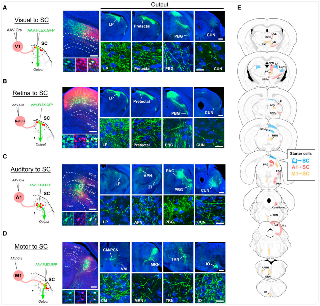 进一步研究特异性接收初级听皮层(A1)和初级运动皮层(M1)输入的SC神经元群。向A1与SC配对注射后,在SC深灰质层(SC-dg)内侧观察到大量GFP阳性细胞,少量散在于上覆的中灰质层(SC-ig)。此标记模式符合已知的A1向SC投射的分布特征。A1输入定义的SC神经元轴突输出明显不同于浅层SC神经元:其主要投射至PBG、导水管周围灰质(PAG)、楔形核(CUN)等区域,而向LP的输入极其稀疏——这与浅层SC神经元向LP的强投射形成鲜明对比。与之相比,M1与SC的配对注射标记了一群局限于SC-ig外侧部的神经元。该SC神经元群的轴突输出模式既不同于A1定义群体,也区别于V1/视网膜定义群体[主要投射至中脑网状核(MRN)、下橄榄核复合体(IO)及被盖网状核(TRN)等区域]。