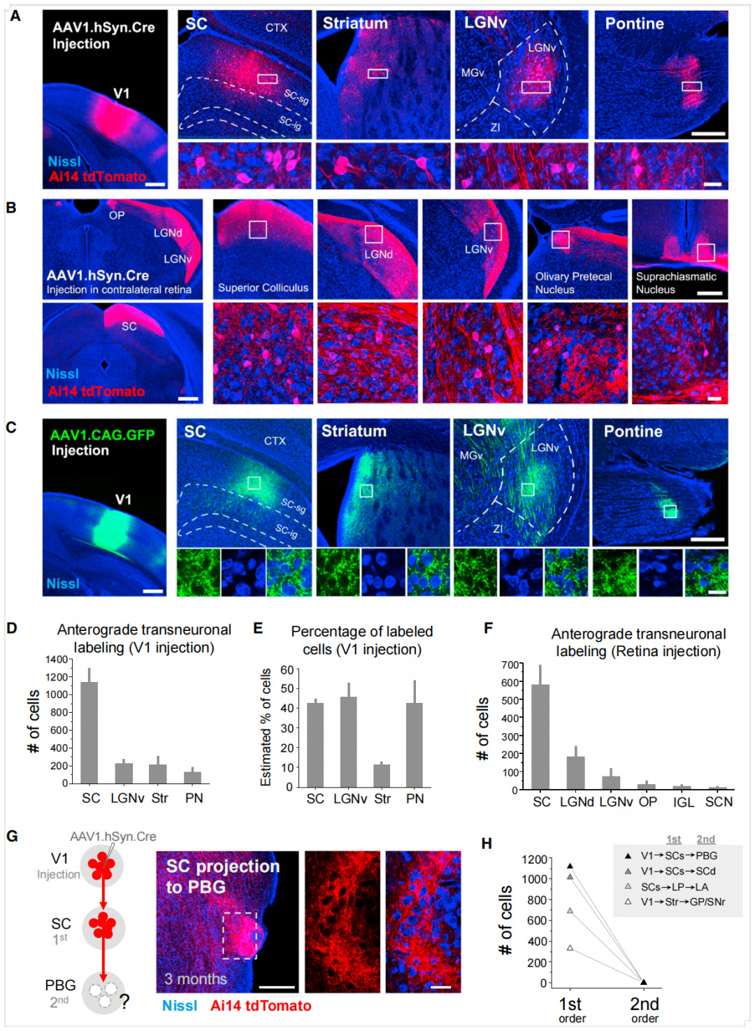 作者统计了每个感兴趣的目标结构中顺行标记的神经元总数。对于V1注射,SC包含的标记神经元数量最多,其次是LGNv、Str和PN。将tdTomato标记的神经元数量与相同局部区域内尼氏(Nissl)染色的细胞体(深蓝色)数量进行了比较。研究者发现,在SC、LGNv和PN中,顺行标记细胞的百分比达到了约40%,这表明接收到跨神经元运输的Cre病毒的神经元数量相对较高。对于视网膜注射,SC同样包含数量最多的顺行标记神经元,其次是LGNd和LGNv。OP、膝状体间小叶(IGL)和SCN也包含少量标记神经元。在已知受V1或视网膜轴突直接支配的区域之外,未观察到任何tdTomato阳性胞体,这表明病毒不会进一步扩散到二阶下游结构。如图2G所示,虽然SC神经元通过V1顺行运输的AAV1-Cre解锁的tdTomato表达被标记,但在受SC直接支配的旁二叠体核(PBG),即使在注射后3个月,也未发现tdTomato阳性胞体。此外,在检查的其他几个二阶核团中也未发现tdTomato标记的胞体。