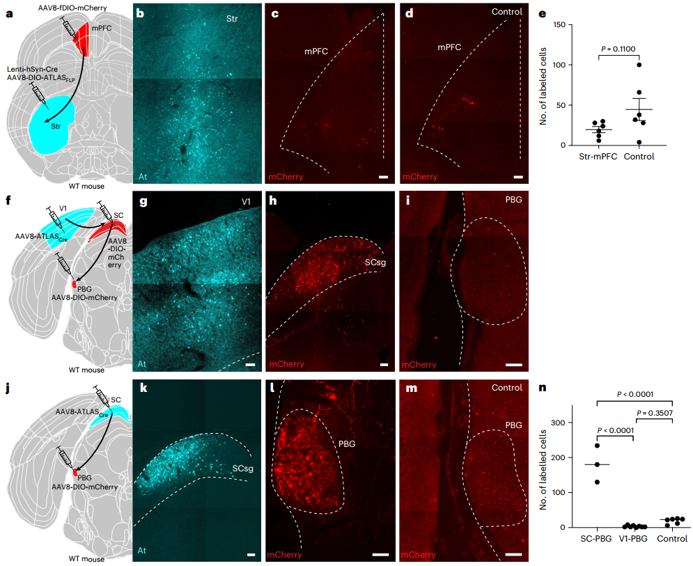 为验证其跨单突触特性,团队针对V1→SC→二叠体旁核(PBG)这一多突触通路展开实验:将AAV8-ATLASCre注入V1,向SC及PBG注射AAV8-DIO-mCherry。结果仅在SC检测到大量mCherry+细胞,而PBG中没有显著高于背景的标记。反向对照中,将AAV8-ATLASCre直接注入SC后,PBG出现显著的mCherry标记,并且显著高于背景和从V1到PBG的标记。证实ATLAS介导的跨突触标记是严格顺行且单突触的。