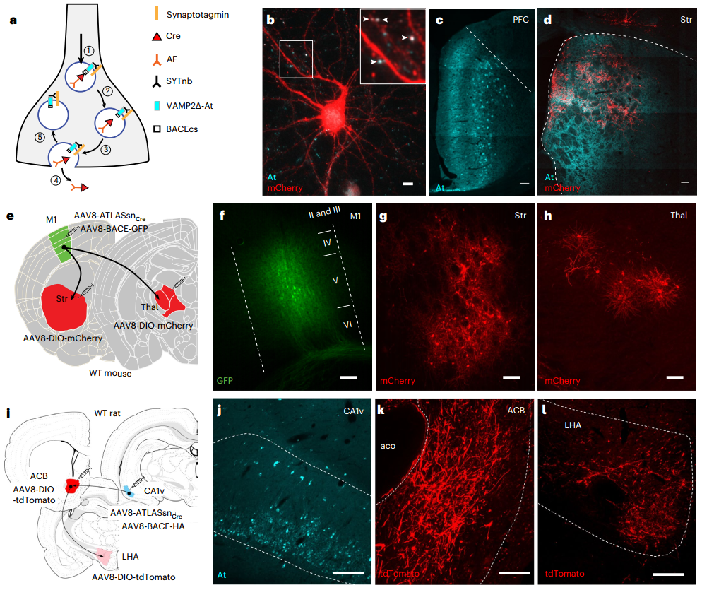 研究团队利用ATLAS的模块化特性进一步对其进行了优化,针对VAMP2高表达产生的毒性(在mPFC表达第2和4周时),研究者将VAMP2胞质结构域替换为靶向突触结合蛋白1的纳米抗体(SYTnb),构建出改良版ATLASsnCre(SYTnb-VAMP2Δ-At-BACEcs-AF-Cre)。该版本在小鼠mPFC中表达2或4周时,均未观察到毒性。体外实验中,ATLASsnCre成功介导突触后mCherry标记,且At信号定位于突触前末梢。体内实验进一步证实:在mPFC→Str通路中,ATLASsnCre联合外源BACE可实现高效跨突触标记,且Str区mCherry+细胞与突触前末梢At标记几乎完全共定位;同时在初级运动皮层(M1)→Str/丘脑(Thal)环路中,Str与Thal均检测到GFP(BACE标记)与mCherry共标细胞,符合跨突触标记特征。以上结果表明,改良版ATLASsnCre不仅消除了毒性,且跨突触标记特征未受影响。