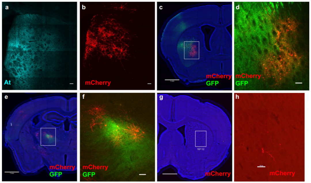 1)病毒搭配方案:AAV-ATLASsnCre-WPRE-pA与AAV-DIO-mCherry/EGFP搭配使用,具体为上游脑区注射ATLASsnCre病毒,下游靶区注射DIO-mCherry/EGFP病毒。