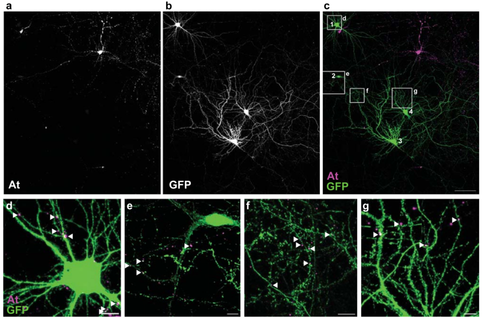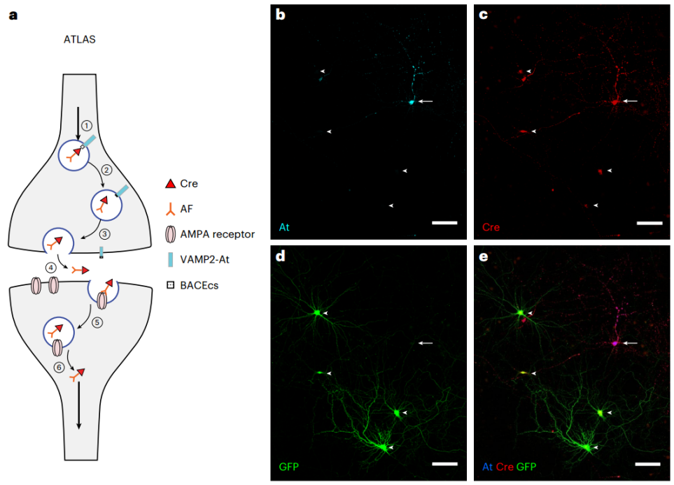 在成功构建AF及其递送机制的基础上,研究者进一步开发了完整的顺行跨突触示踪工具ATLAS。首先,将报告蛋白SEP替换为Cre重组酶,构建了ATLASCre(VAMP2-At-BACEcs-AF-Cre),并在ATLAS蛋白中引入含强核定位信号的CCR5 DNA结合域,以确保AF-Cre能被递送至突触后细胞核,从而实现对突触后细胞的遗传学调控。为验证该策略,研究人员将ATLASCre转染至已感染AAV8-DIO-GFP的原代培养细胞中,成功观察到未被At标记却表达GFP和Cre的神经元,且At标记(表明是起始细胞)的突触前结构与GFP+神经元的树突紧密相邻或重叠,表明ATLASCre可介导跨突触示踪及Cre的核转位,并为突触后细胞提供遗传学调控的可能。