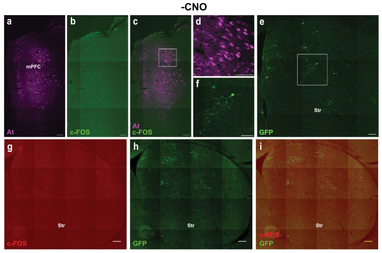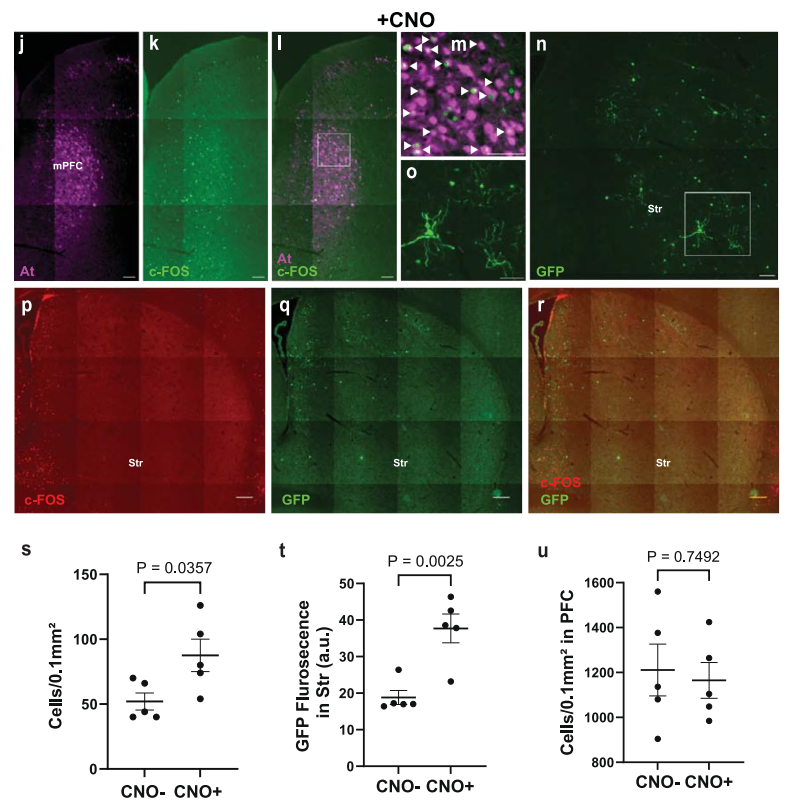 为检验ATLAS在体内跨突触标记的活动依赖性,团队在mPFC共注射AAV8-ATLASsnCre与化学遗传激活病毒AAV8-hHM3Dq-mCherry,并在Str注射AAV8-DIO-GFP。结果显示,连续腹腔注射CNO的小鼠mPFC区存在大量c-Fos标记且与At共定位,未注射CNO的小鼠mPFC中仅检测到极少的c-Fos标记;且注射CNO的小鼠Str的GFP+细胞数及总荧光强度均显著高于未激活组(未注射CNO)。证实ATLAS的跨突触标记效率依赖于起始细胞的活动状态。
