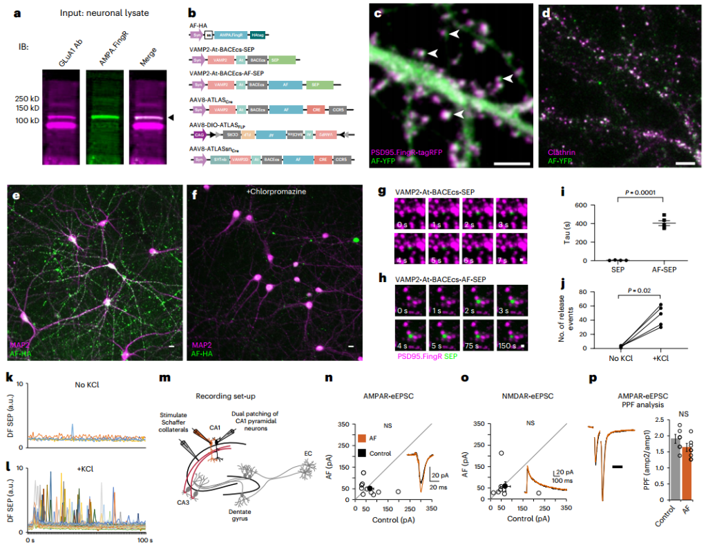 进一步用AF-SEP融合蛋白测试发现,释放后的荧光信号显著延长(405±60秒vs SEP的6±2秒),这与AF释放后结合到突触后膜并持续存在直至被内吞的特征相符。更重要的是,高钾去极化刺激使AF-SEP释放事件数量激增约15倍,表明AF-SEP是从突触小泡释放的。即AF-SEP从突触小泡释放后,穿过突触间隙,结合到相邻突触后神经元的突触周围区域,随后被内吞。此外,在海马CA1神经元的实验中,ss-AF-YFP的表达对AMPA受体、NMDA受体诱发的兴奋性突触后电流(eEPSCs)振幅及双脉冲易化均无显著影响,表明AF的表达不影响突触传递。