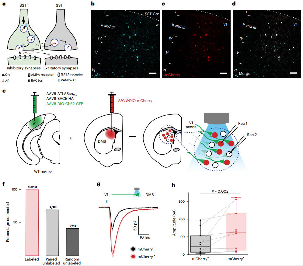 为明确ATLAS跨突触标记的突触特异性,研究团队利用SST-Cre小鼠(生长抑素(SST)阳性抑制性中间神经元特异性表达Cre酶)进行实验:在SST-Cre小鼠的V1区注射AAV8-DIO-ATLASFLP与AAV8-fDIO-mCherry。由于抑制性突触缺乏GluA1受体(ATLAS内吞的必需靶点),理论上出现任何跨神经元标记都必然是非突触性的。结果显示,两周后V1中几乎所有表达mCherry的神经元都被At共标记,证明ATLAS仅通过蛋白质的跨突触转运对突触后神经元进行标记。