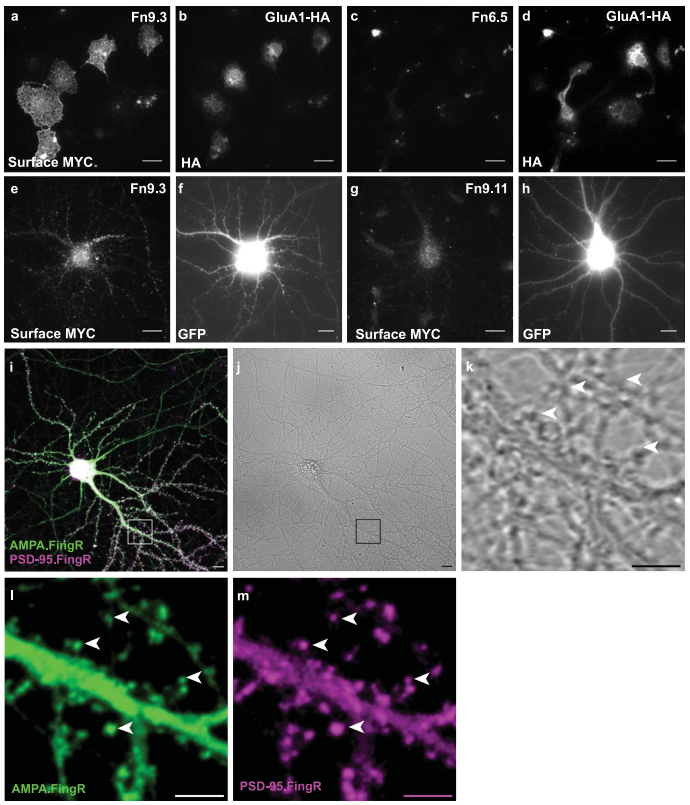 研究团队首先通过mRNA展示技术,从特定的mRNA-蛋白质融合文库中筛选出能与大鼠GluA1第1-394位氨基酸结合的结合物(纤维连接蛋白变体),在筛选获得的纤维连接蛋白变体中,Fn9.3克隆(命名为AMPA.FingR,简称AF)在原代皮层神经元中展现出最优的标记效果。为进一步表征AF,研究人员在原代皮质神经元中共表达其分泌型ss-AF-YFP(ss指GluA1信号序列)和突触后标记物PSD-95.FingR-tagRFP。结果显示AF与PSD-95.FingR-tagRFP部分重叠,提示其突触周围定位特征,同时,AF还与内源性网格蛋白共定位,提示其内吞区定位特征。进一步实验显示,外源性添加AF能使培养的皮质神经元被AF标记,而网格蛋白抑制剂氯丙嗪能显著抑制这一过程,证实AF的内化由内吞作用介导。