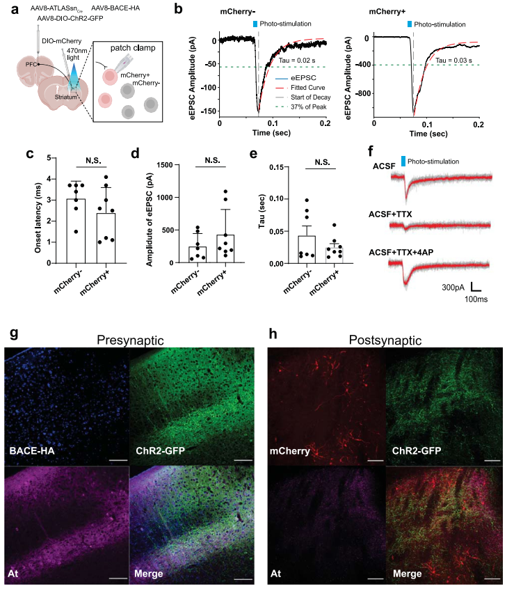 为评估ATLAS对突触传递的影响,研究人员在mPFC共注射AAV8-ATLASsnCre(优化版ATLAS)、AAV8-BACE-HA及AAV8-DIO-ChR2-GFP,并向Str注射AAV8-DIO-mCherry。通过测量Str细胞中470 nm光诱发的mCherry+(ATLAS系统标记)与mCherry-(未被ATLAS系统标记)细胞的eEPSC,发现两组光诱发eEPSC的幅度、潜伏期及时间常数均无显著差异。此外,团队结合河豚毒素(TTX,阻断动作电位和多突触传递)与4-氨基吡啶(4-AP,可阻断K+通道并促进突触前末梢直接激活)验证了电流为单突触性质。以上结果表明ATLAS不影响突触传递功能且无毒性。