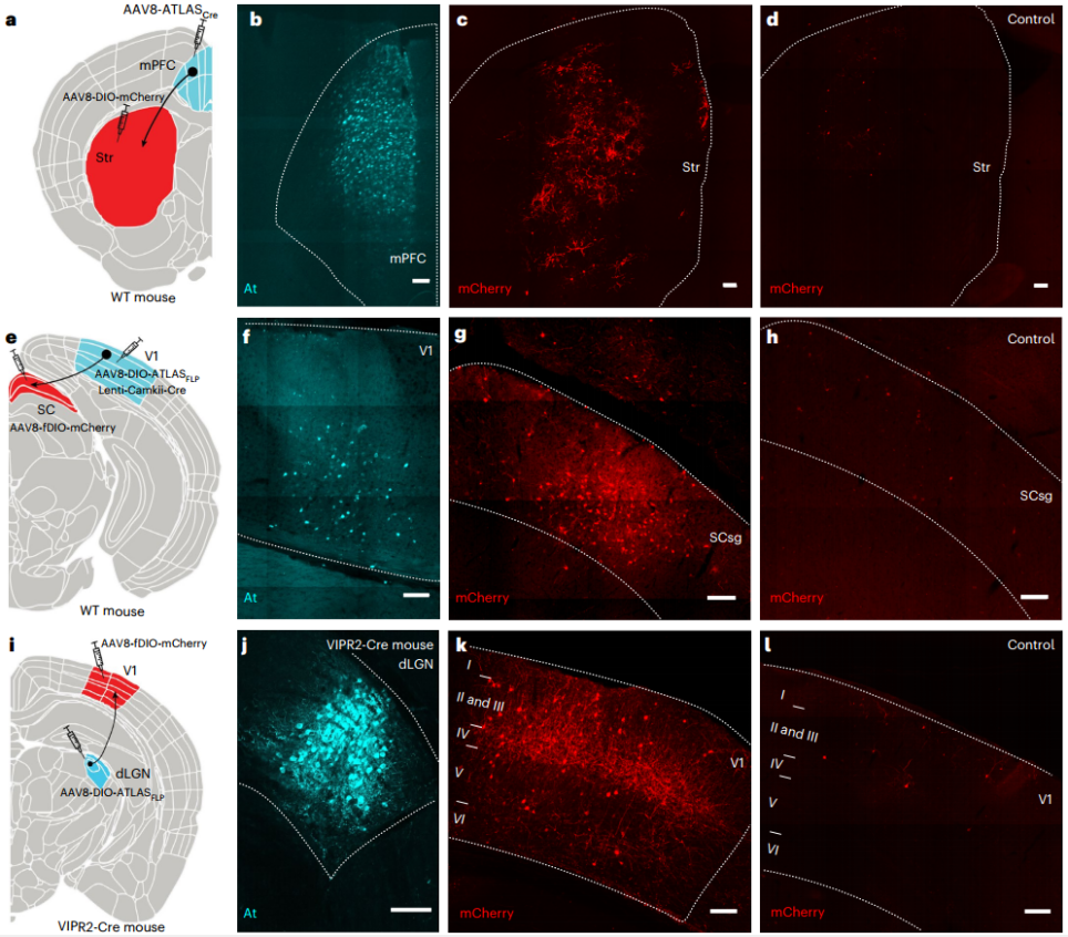 为验证其体内效能,研究者将AAV8-ATLASCre注射至小鼠内侧前额叶皮层(mPFC),同时将AAV8-DIO-mCherry注射至其下游脑区纹状体(Str)。一周后,在mPFC中检测到了At染色,并且在Str观察到大量mCherry+细胞,而对照组(无ATLASCre)则无此现象,证实ATLAS在体内可实现顺行跨突触标记。