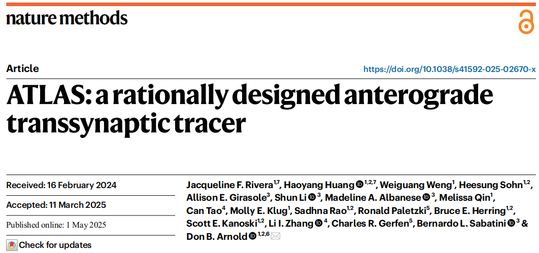 2025年5月,美国南加州大学Don B. Arnold团队在期刊Nature Methods上发表了题为“ATLAS: a rationally designed anterograde transsynaptic tracer”的研究论文,该研究开发了一种基于合理设计蛋白质ATLAS的顺行跨单突触示踪工具,可介导从基因定义细胞出发的顺行跨突触标记。ATLAS在神经元中表达时,会促使突触前膜释放包含两种功能成分的货物:一是抗体样蛋白AMPA.FingR(可特异性结合GluA1的N端——GluA1为AMPA型离子型谷氨酸受体的关键亚基);二是重组酶。该货物释放至突触间隙后,AMPA.FingR通过与突触后膜GluA1的N端结合形成复合物,进而介导整个货物被突触后细胞的内吞作用摄入;进入细胞后,重组酶在核定位信号引导下被输送至细胞核,最终通过切割报告基因中的特异性识别序列(如loxP位点),触发重组酶依赖的报告基因表达。在小鼠实验中,ATLAS能介导从随机或基因定义细胞出发的跨神经元单突触示踪,该示踪具有严格的顺行性、突触特异性、无毒性以及活动依赖性,可标记特定行为相关的活跃环路,同时其模块化组件可被独立替换或修饰,是一种可通过升级或改造来执行特定任务的多功能平台,为未来神经环路精细图谱的绘制及功能研究提供了强大且可扩展的有力工具。