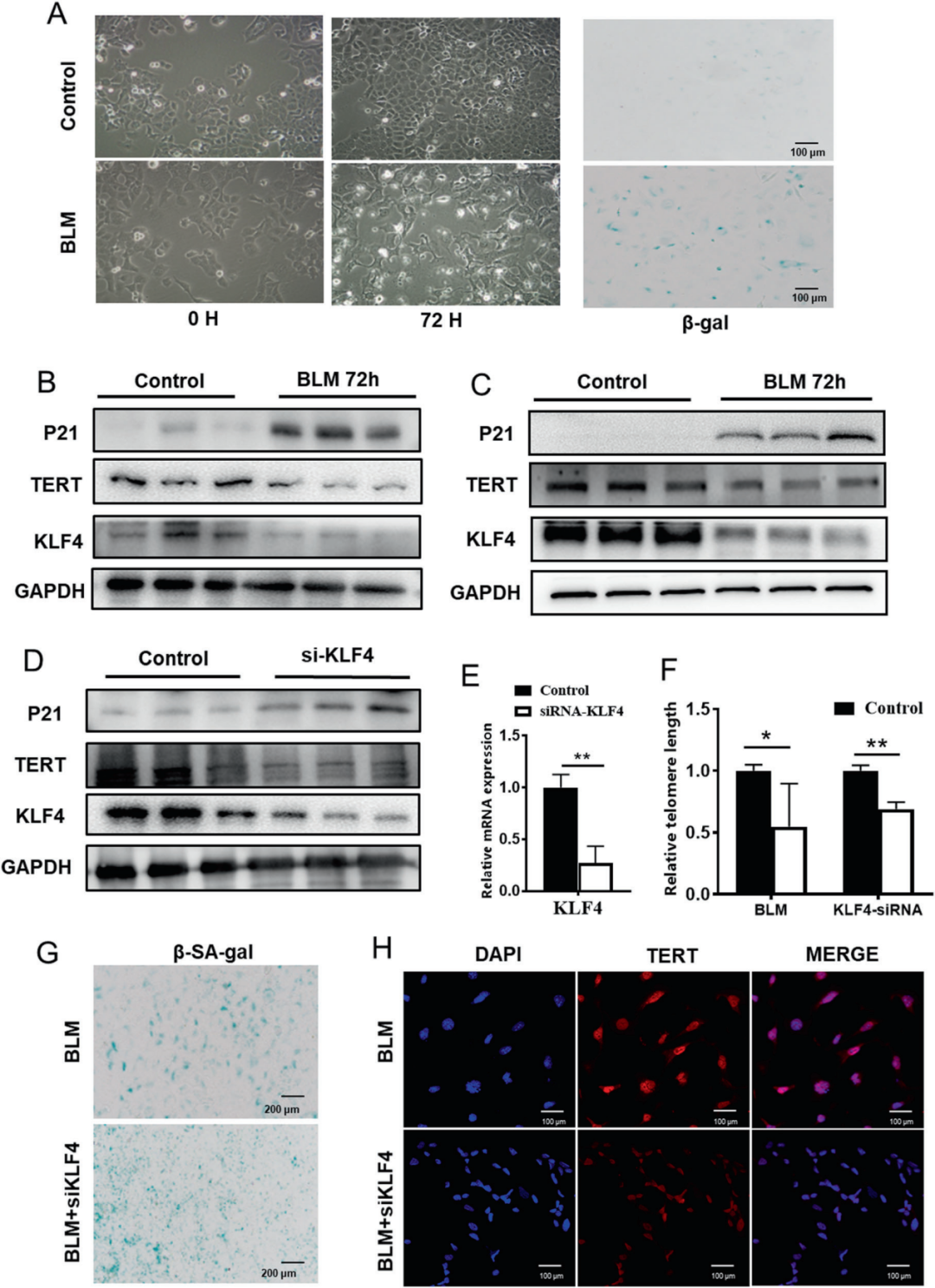为进一步确认KLF4在AECs中的作用,研究者在MLE-12细胞(小鼠肺泡II型上皮细胞)中检测了KLF4对TERT和衰老的影响。首先,研究人员在培养基中用10 μg/mL的BLM处理MLE-12细胞12、24、48和72小时。结果显示,处理72小时后,细胞变大、出现空泡,有时表现为多核或巨核形态。β-gal染色显示,BLM增加了衰老细胞的数量。此外,在BLM刺激的细胞中,P21的表达增加而TERT的表达降低(同时KLF4的表达下调)。这些结果表明体外衰老AECs模型已成功构建。
