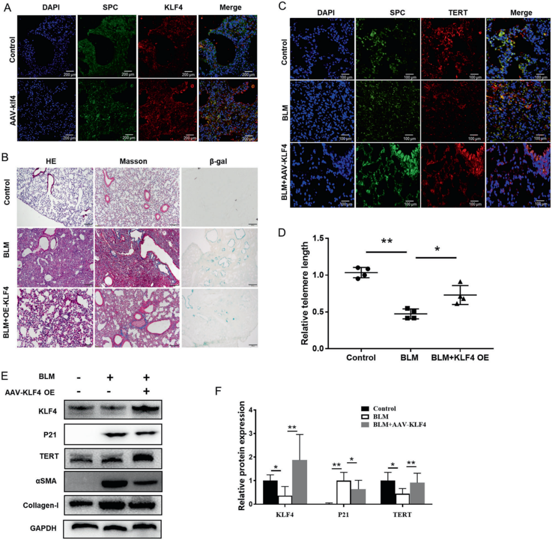 随后,研究人员通过随机数字表法将老年(6月龄)小鼠随机分为两组(对照组和BLM组),实验组气管滴注BLM。正如预期,BLM处理14天后的小鼠肺切片在苏木精-伊红染色(H&E)和Masson染色中显示出明显的肺泡损伤、结构破坏及肺泡实质中纤维化胶原的积聚。免疫组化显示,与对照组相比,BLM诱导的小鼠肺组织中衰老标志物P16、P21和P53的表达显著增加。研究者还发现,纤维化肺组织的上皮区域出现了衰老相关β-半乳糖苷酶(SA-β-gal)阳性染色(衰老细胞被标记为蓝色)增加,这在正常肺组织中几乎看不到。与人类肺组织的结果一致,qPCR和蛋白免疫印迹证实,在BLM诱导的肺纤维化组织中,P16、P21的表达升高,而TERT的表达降低。同时,蛋白免疫印迹也表明,纤维化肺组织中KLF4表达下调,而纤维化标志物(α-SMA和Collagen-I)表达上调。免疫荧光染色显示,在BLM诱导的肺纤维化组织中AECs的TERT表达降低。此外,端粒长度检测也表明,BLM诱导的纤维化肺组织具有缩短的端粒长度。这些结果表明,BLM诱导的肺纤维化模型小鼠的AECs发生了衰老,且KLF4和TERT的表达显著降低。