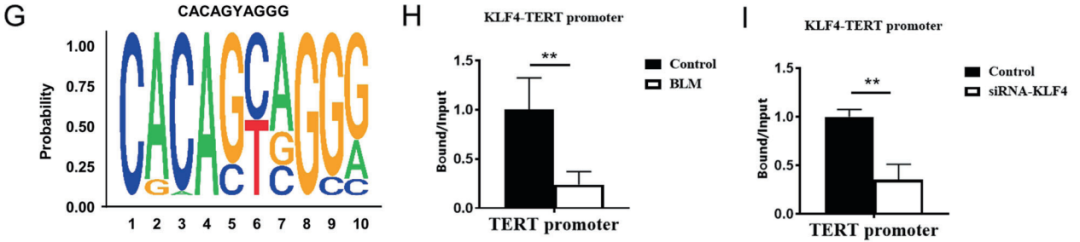 为进一步探索KLF4在TERT调控中的作用,研究人员在MLE-12细胞中进行了染色质免疫沉淀(ChIP)测序和ChIP-qPCR。ChIP测序结果显示,KLF4能够结合到TERT启动子基序,同时也能结合R端粒酶和TIN2(它们也是端粒相关基因),这表明KLF4可能通过转录水平调控TERT的表达。ChIP-qPCR结果表明,在BLM组、siKLF4组中,KLF4结合的TERT启动子的转录均减少,这表明BLM处理导致的KLF4下调会降低TERT的转录水平,从而减少TERT的蛋白表达。这些结果证明,KLF4在TERT和端粒长度的调控中具有重要作用,其机制很可能是通过作用于TERT启动子。